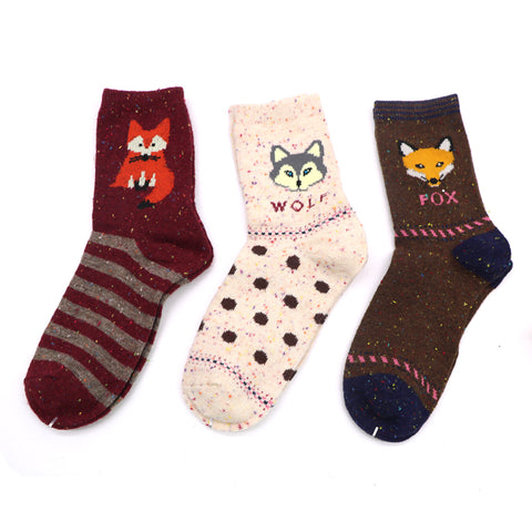 Women Cute Fox Wolf Pattern Winter Warm Rabbit Wool Blend Crew Calf Tube Socks