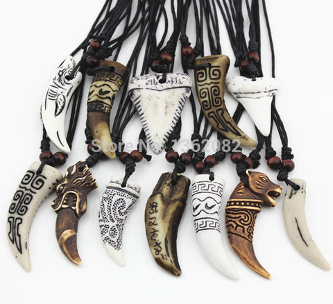 Wholesale 12pcs Mixed Cool Imitation Bone Carved Dragon Totem Shark/Wolf Tooth Pendant Necklace Amulet MN465